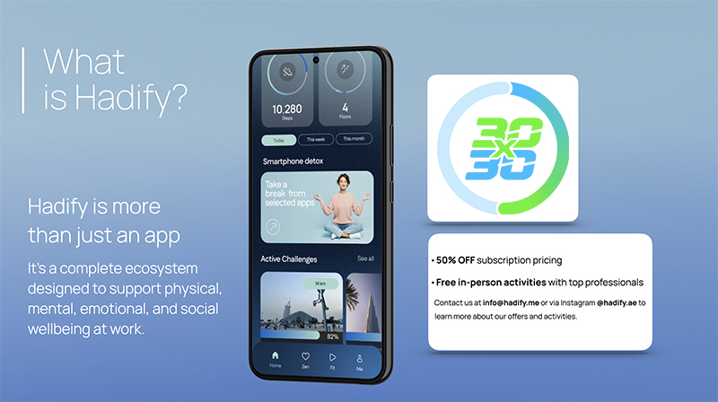 The Hadify app delivers a holistic wellbeing ecosystem for both physical and mental health. It goes beyond standard fitness tracking by offering personalised company challenges, exclusive medals, and guided wellness tools. Users can also join themed challenges like the “Hatta Challenge” or “Around the World” steps challenge during DFC.